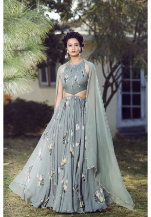 Olive green printed ruched back cut-out anarkali and a georgette pearl embellished dupatta.....