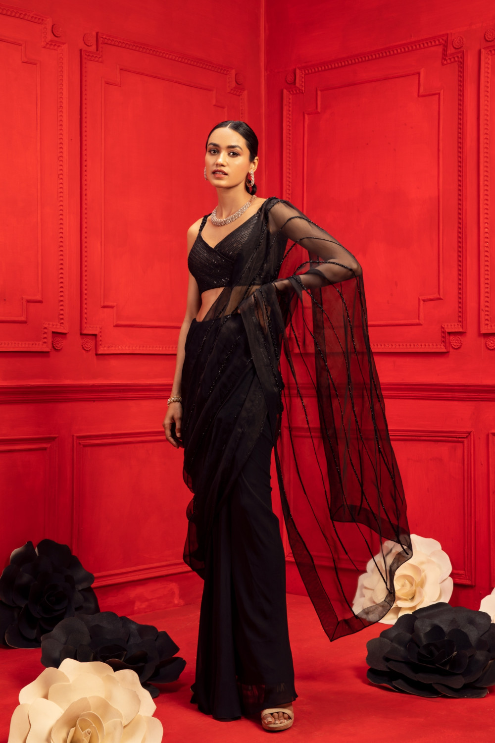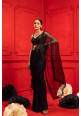 Black georgette draped saree with an embroidered pallu in organza and an embroidered blouse