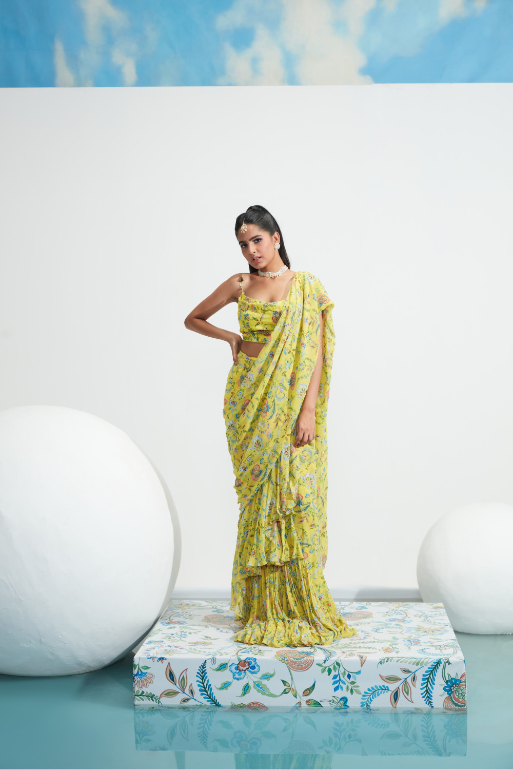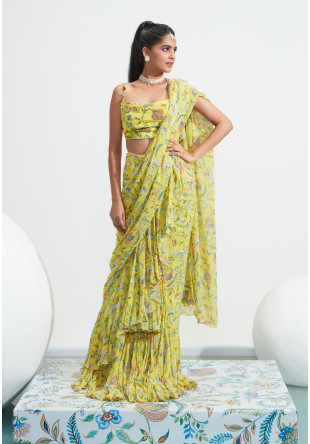 Yellow printed pre-stitched saree in georgette with ruffles paired with an embroidered satin organza blouse