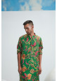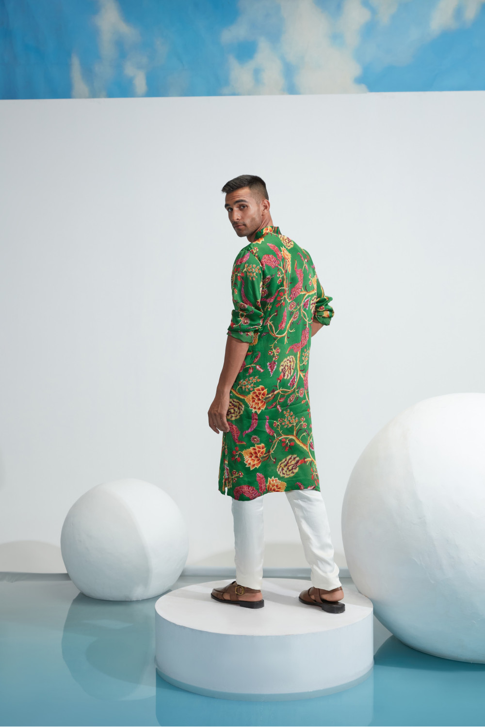 Green printed kurta in satin-organza with ivory satin-organza pants