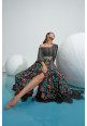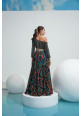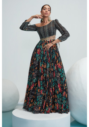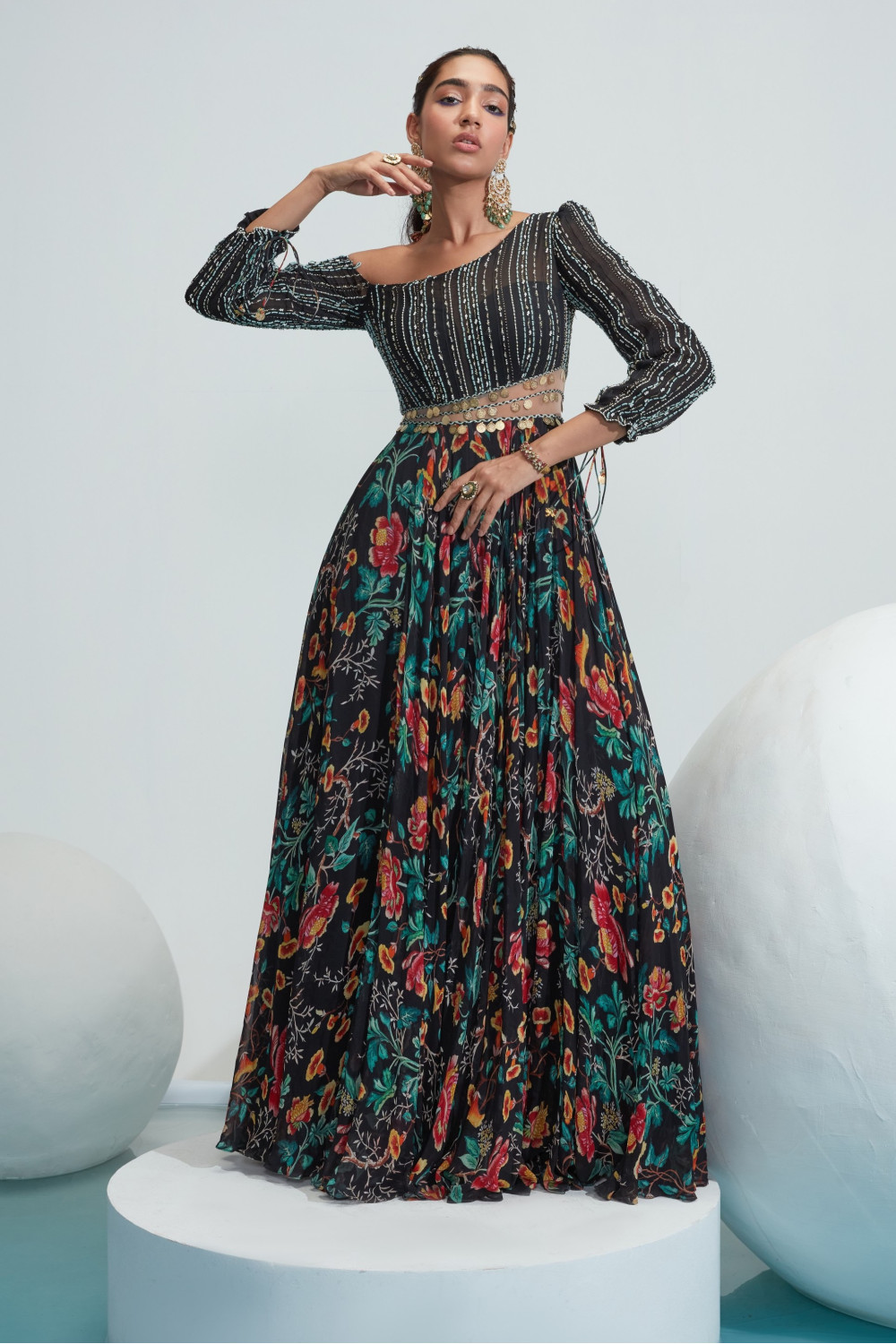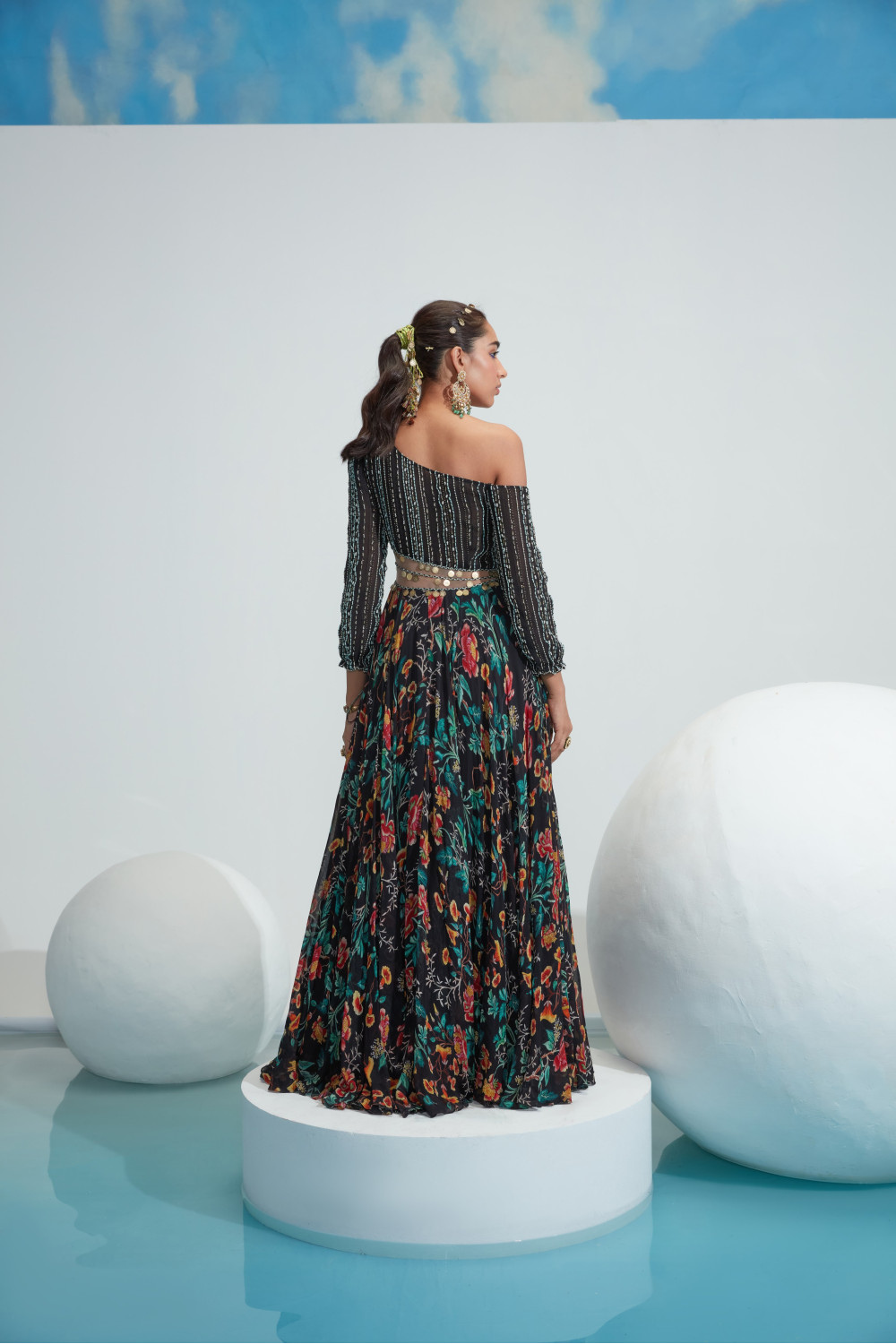 Black georgette top with a choke collar and open back paired with a net lehenga with floral thread e.....