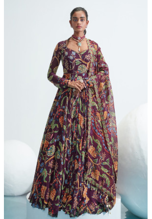Purple embroidered anarkali in georgette paired with an embroidered organza dupatta with tassels at the hem