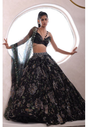 Black organza ruffled blouse with an embroidered lehenga and dupatta