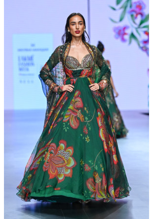 Green organza embroidered anarkali with a matching dupatta