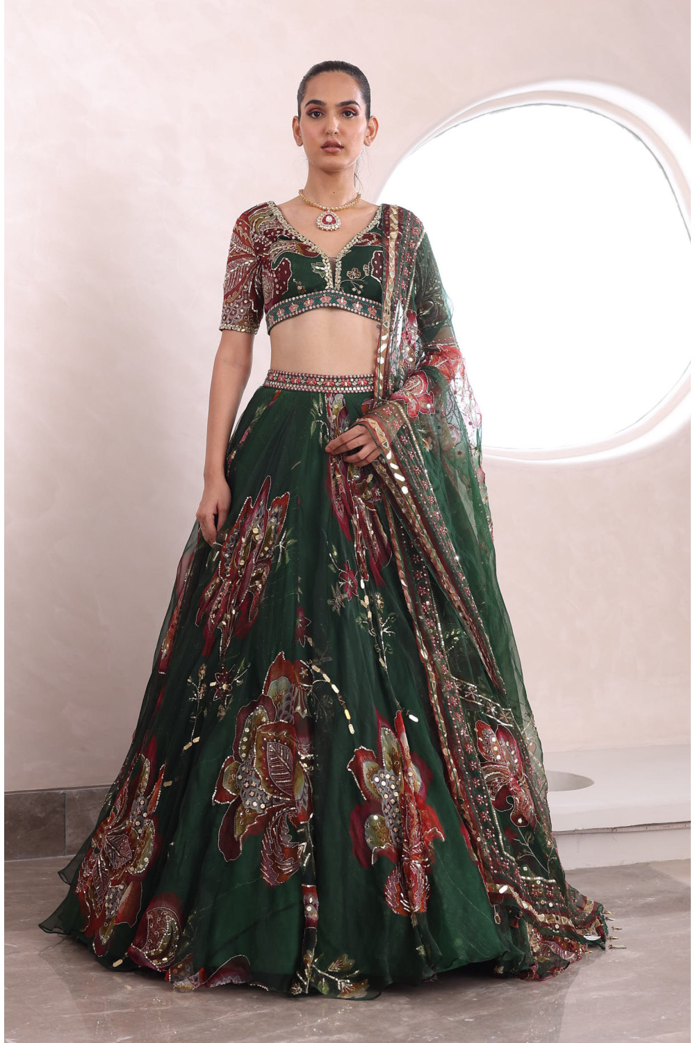 Green organza, embroidered blouse with a heavily embroidered lehenga and matching dupatta .....