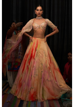 Organza rang-print embroidered lehenga with a blouse and matching dupatta