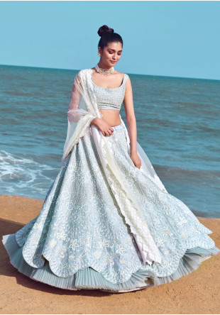 Powder-blue pyramid embroidered heavy net lehenga with a side drape net blouse and palla.....