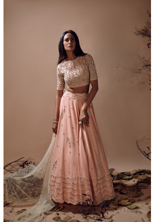 Muted pink tulle lehenga and crop top with butti and sequin embroidery.....