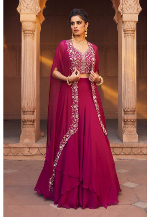 Maroon 3D flower cape in organza with an embellished silk bustier and organza skirt.....