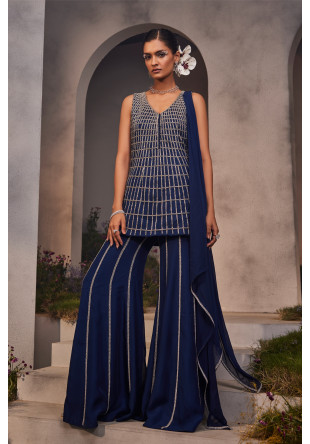 Electric-blue net kurta with geometric embroidery, lines embroidered organza sharara and a handkerch.....