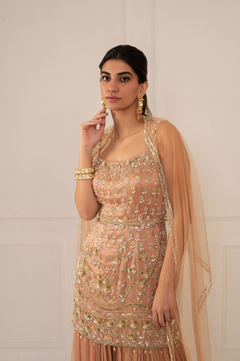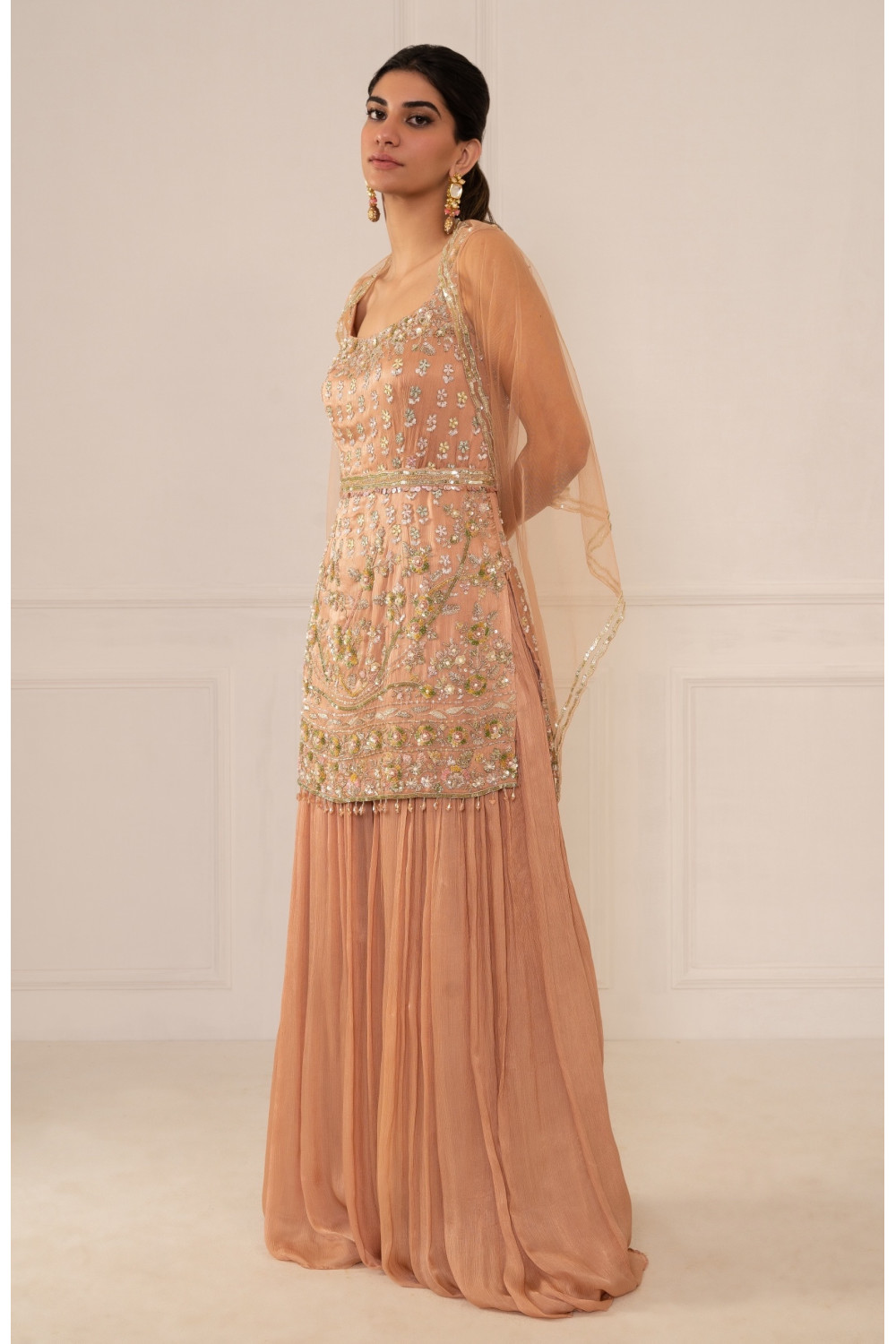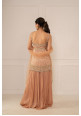 Nude peach kurti and sharara set in silk chiffon and net with zardosi hand embroidery