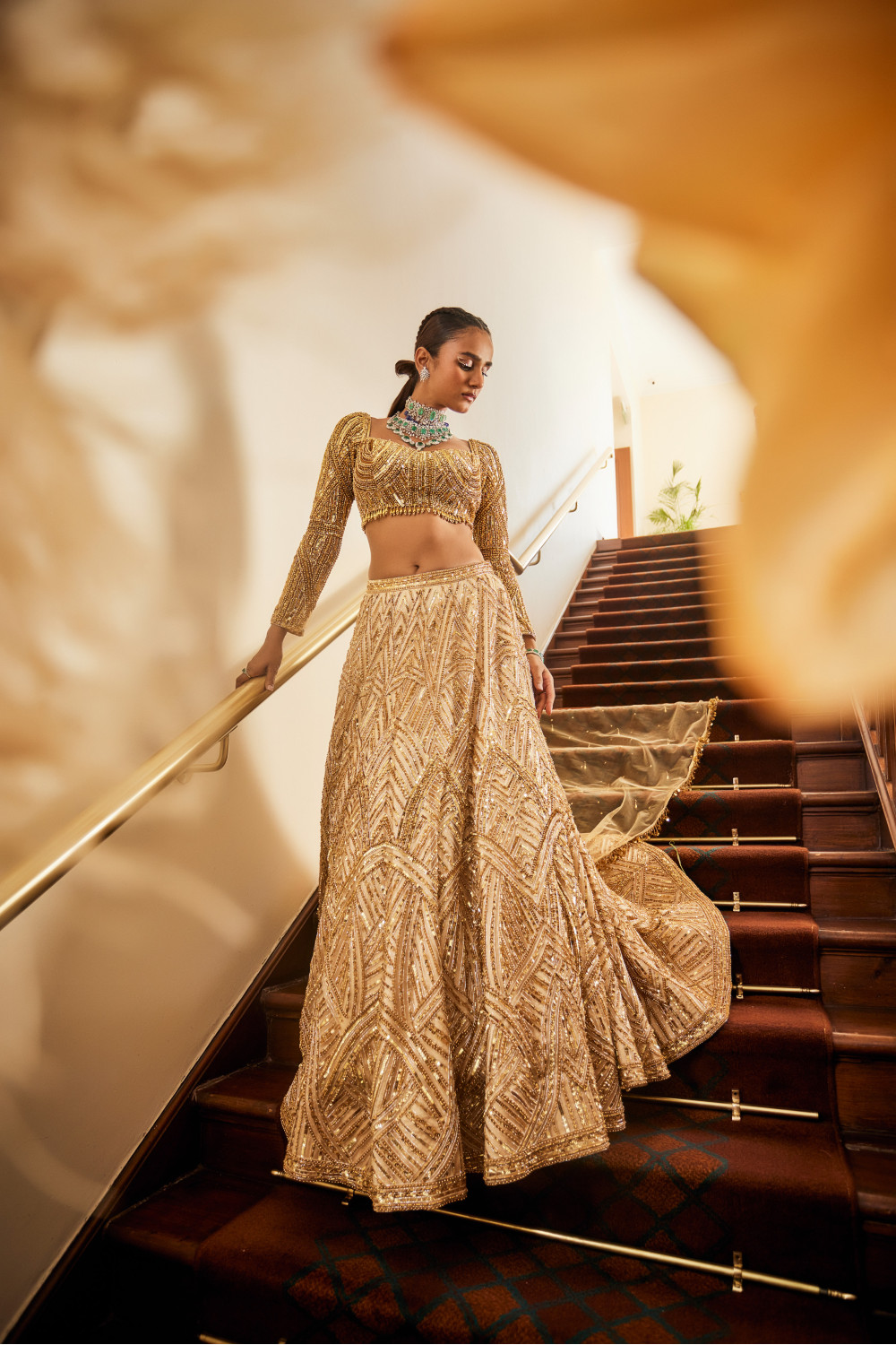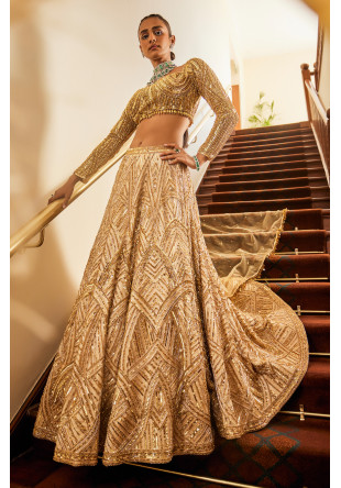 A gold zardozi embroidered blouse with tassels on waist and lehenga. This comes with a net dupatta w.....