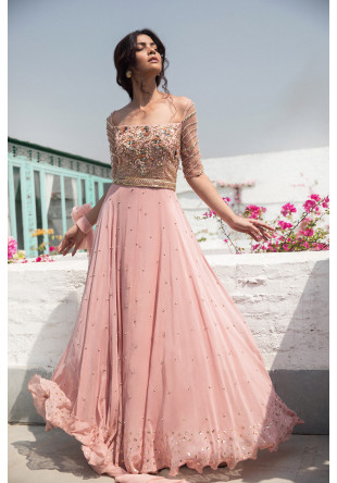 Rose-pink hand embroidered net lehenga with a silk lining and silk ruffle detailing with a net embel.....