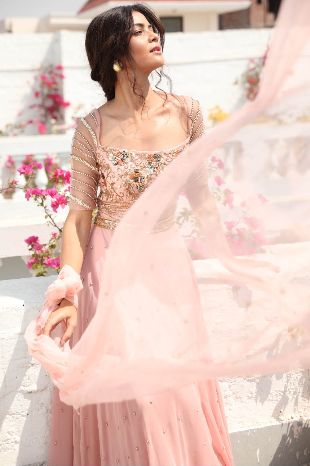 Pink embroidered anarkali with French knotted sequin embroidery and cheeta all over the ghera paired with a net dupatta. Embroidered belt included.