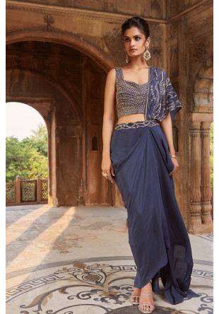 Navy-blue pre-draped crepe skirt with an attached curvy line embroidered-front palla in organza pair.....
