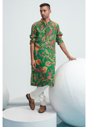 Green printed kurta in satin-organza with ivory satin-organza pants.....