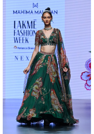 Green organza, embroidered blouse with a heavily embroidered lehenga and matching dupatta .....