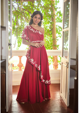 Maroon 3D flower cape in organza with an embellished silk bustier and organza skirt.....