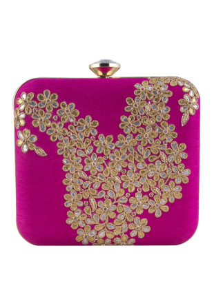 Pink hand embroidered clutch bag with a detachable chain. .....