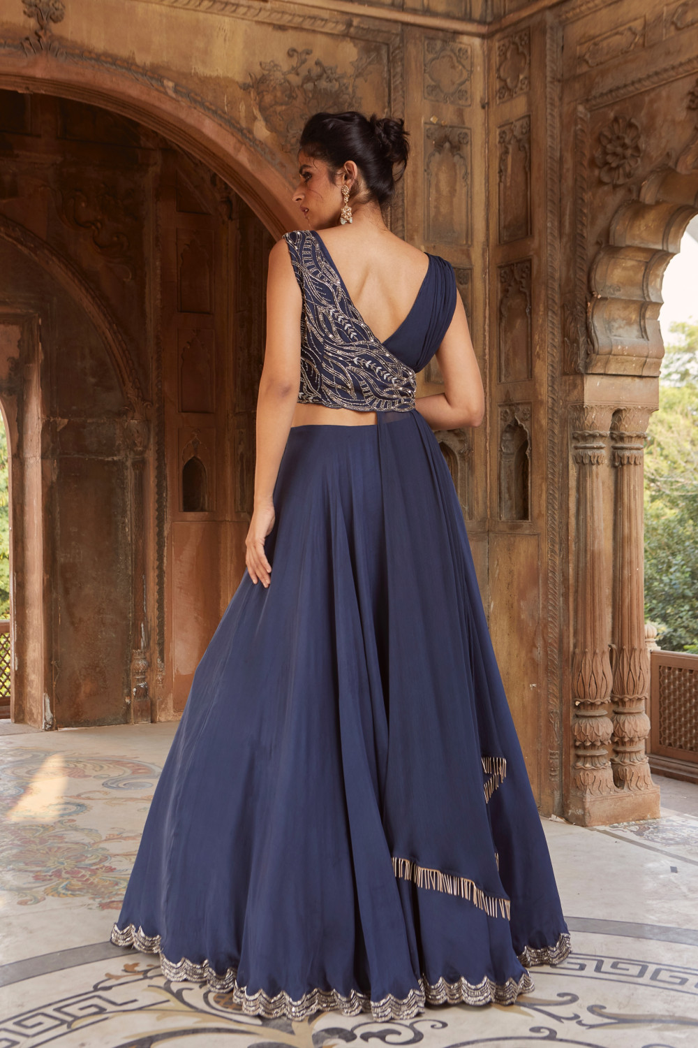 Navy-blue overlap tussar jacket with a front and back asymmetric draped chiffon dupatta and scallop embroidered organza lehenga