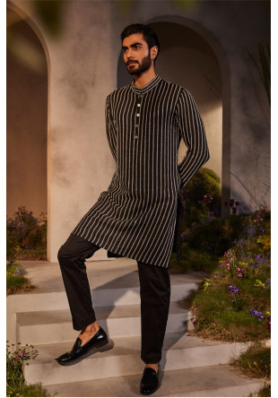 Black silk kurta with a line and thread detailed kurta and stretch fabric pants.....