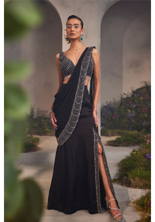 Black pre-draped satin organza slit-leg saree and silk blouse with scallop pattern embroidery