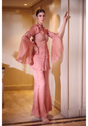 Coral-pink co-ord paired with an overlay embroidered tassle blouse in organza and crepe