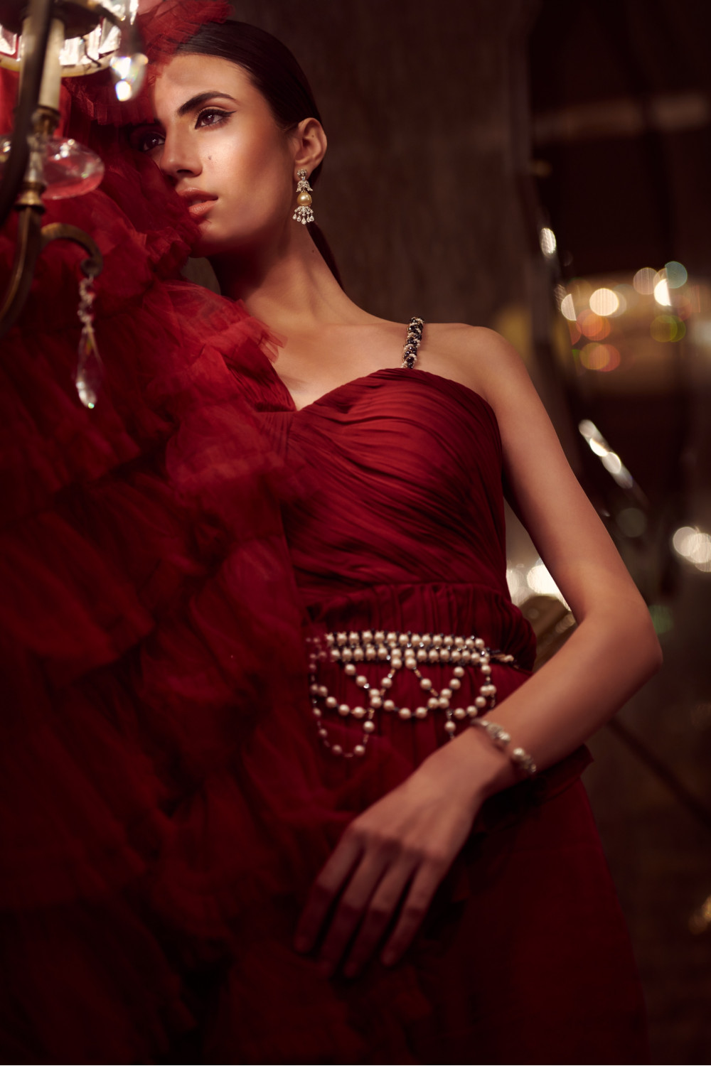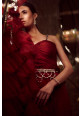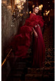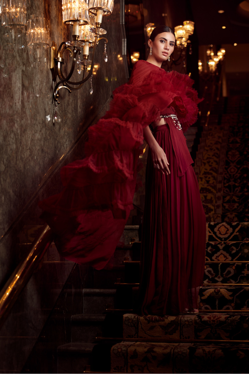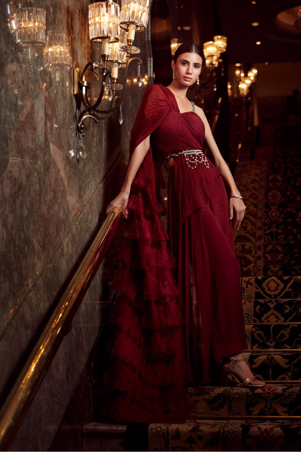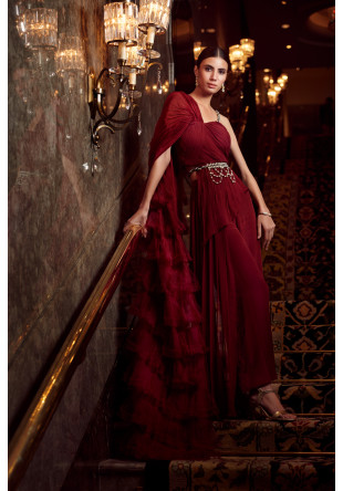 Cherry-red draped saree in crepe, organza and chanderi with palazzo pants paired with a pearl belt