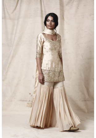 Off-white deep back short kurta in silk with gota work all over and tie-up details at the back paired with matching gharara pants in georgette and an off-white dupatta with scattered motifs.