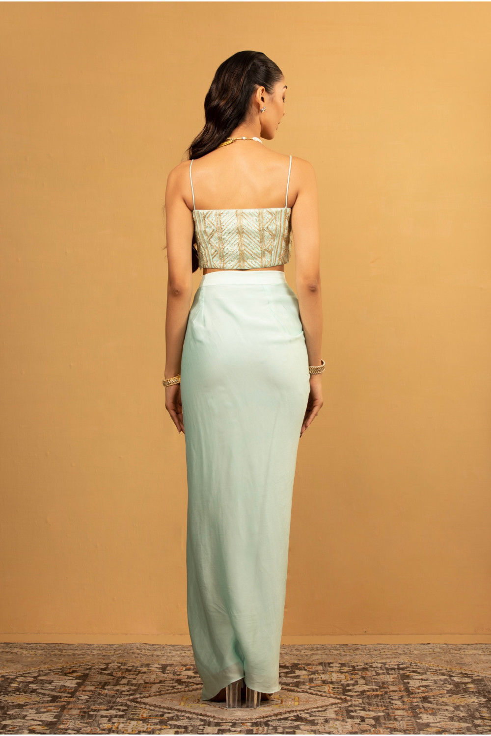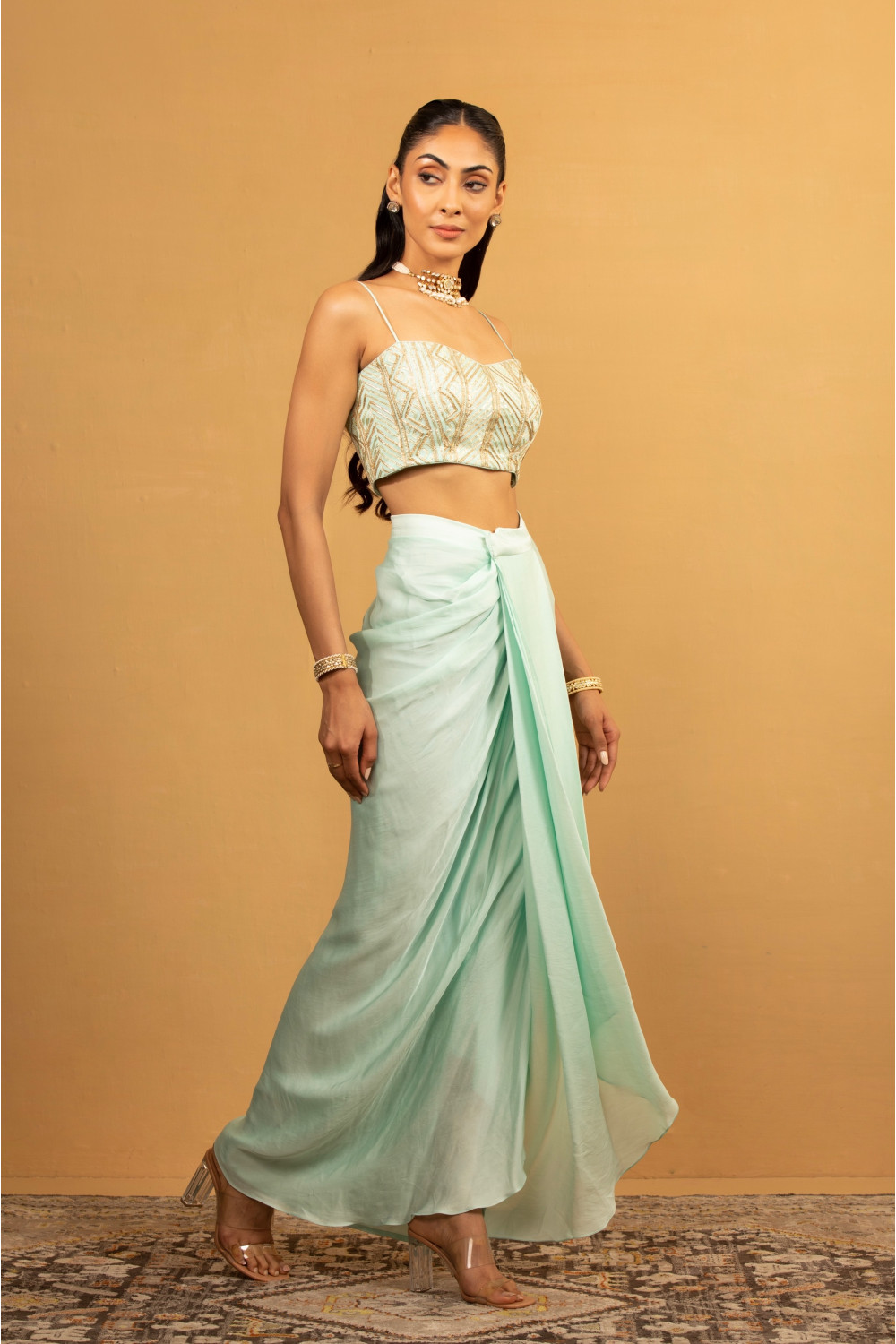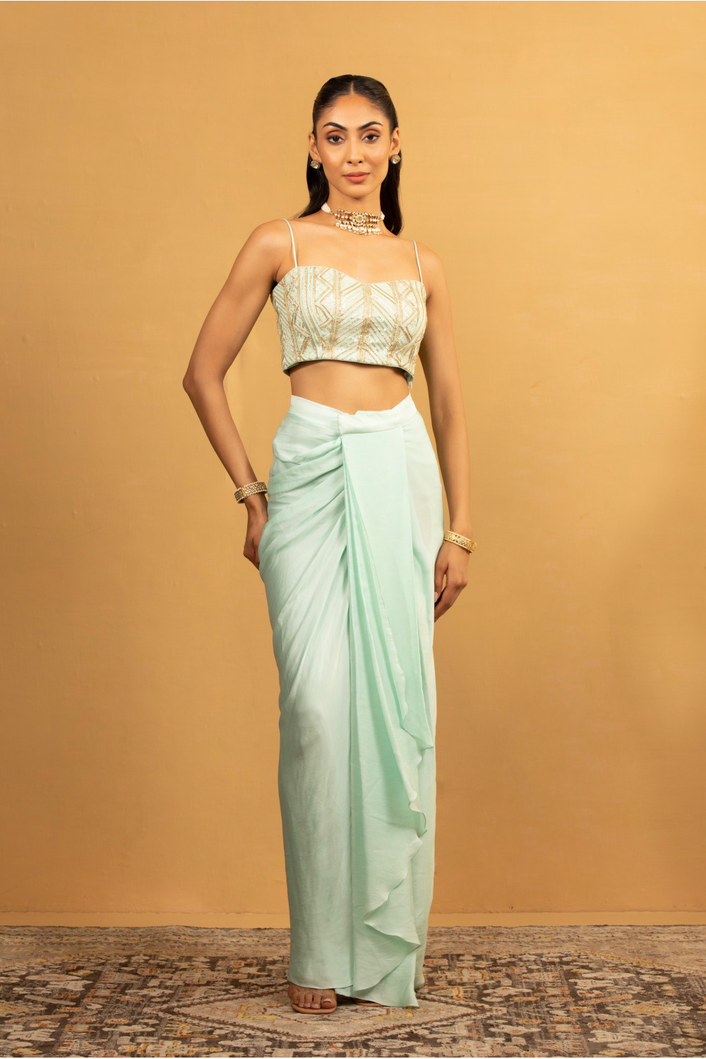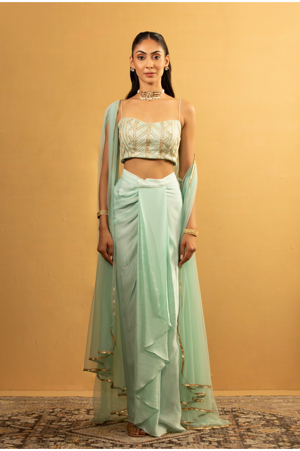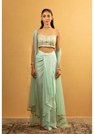 Ice blue gota-work top in georgette paired with a pre-draped dhoti and a net capeCareDry clean onlyShippingShipping takes 5-6 weeks to deliver item to the country of destination. Buyer is responsible for any tax or duty required to ship to their country.