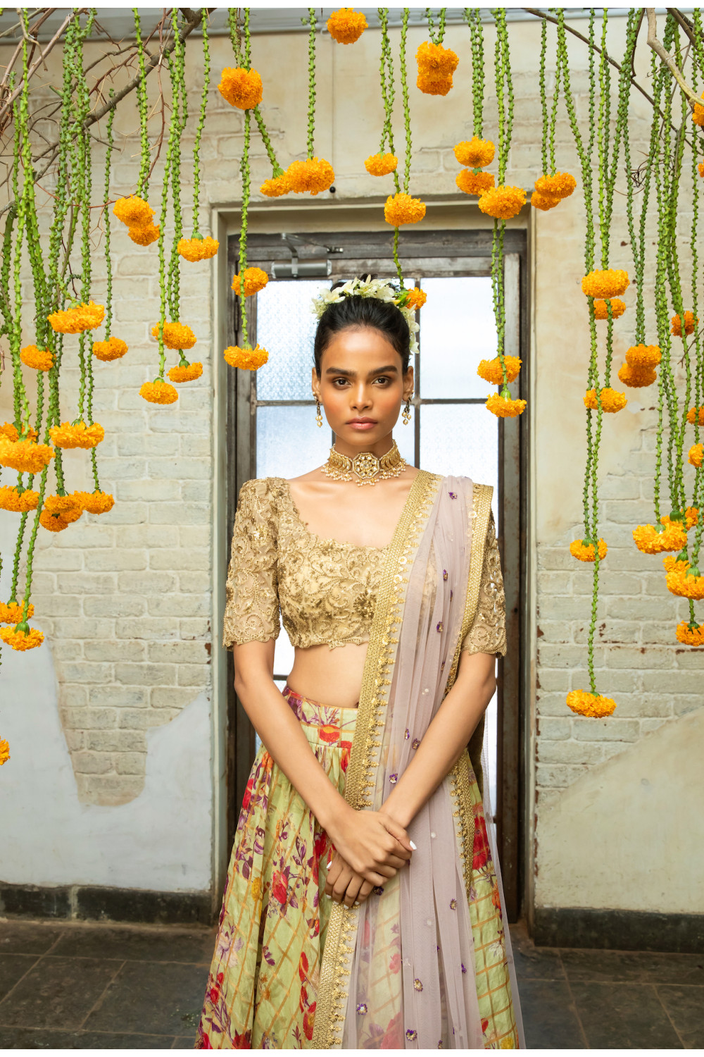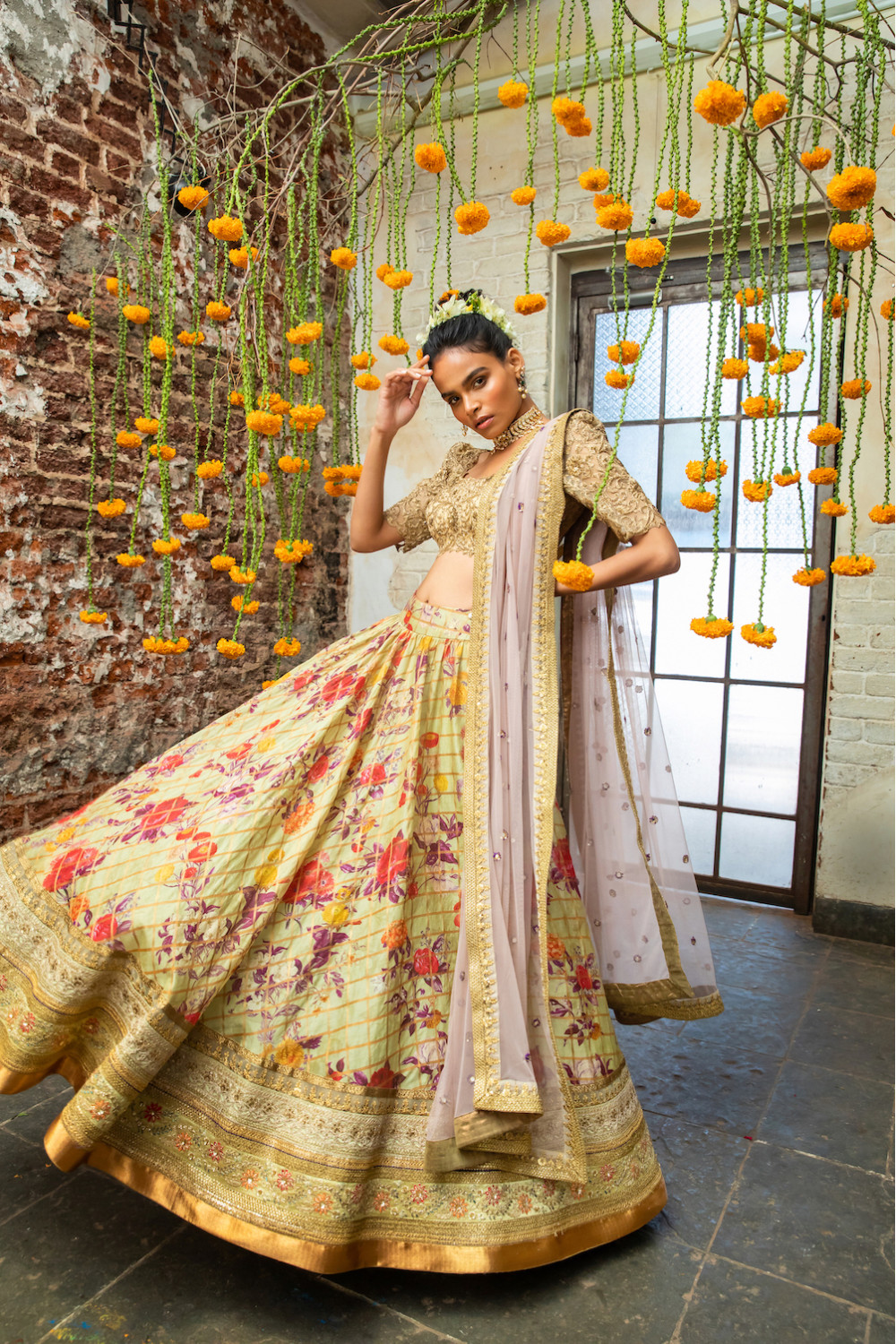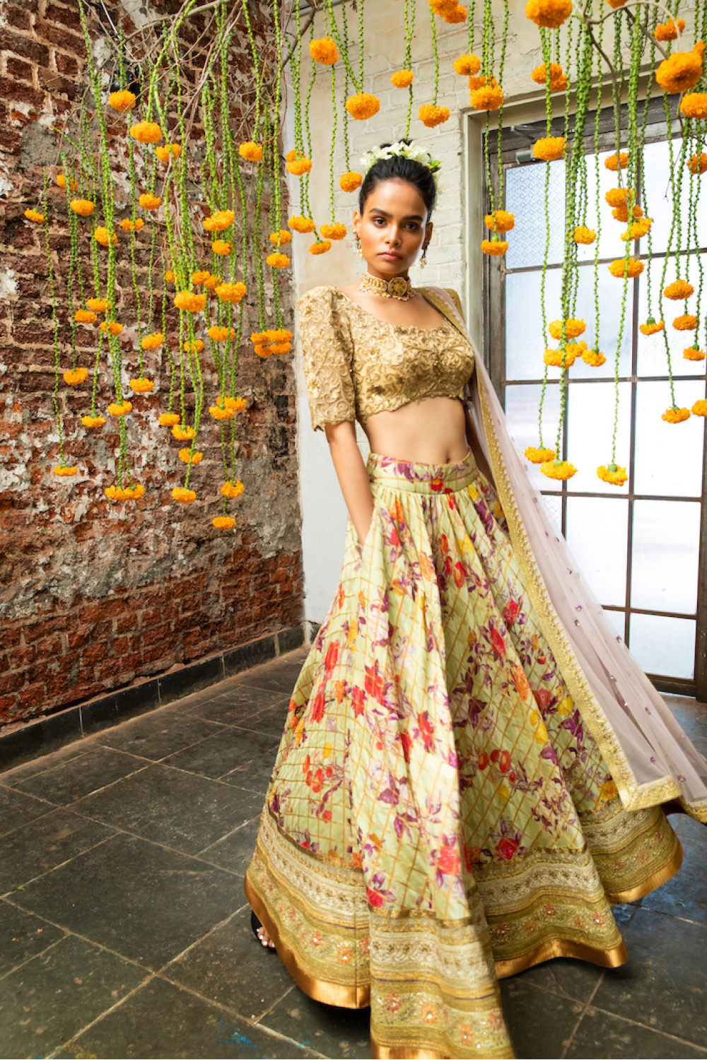 Gold embroidered blouse with a pistachio green floral and gold plaid lehenga wit.....