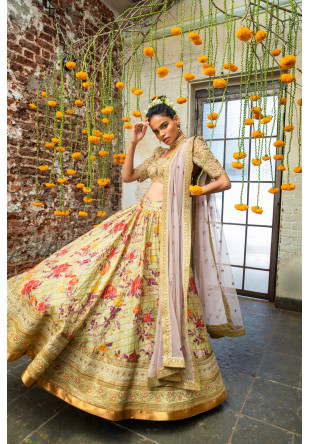 Gold embroidered blouse with a pistachio green floral and gold plaid lehenga with borders and side pockets paired with a lavender sheer net dupatta with embroidered floral motifs and borders