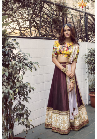 Yellow floral crop top with shoulder cut-outs and a shoulder strap, burgundy skirt in silk with borders, and a blush dupatta in soft net
