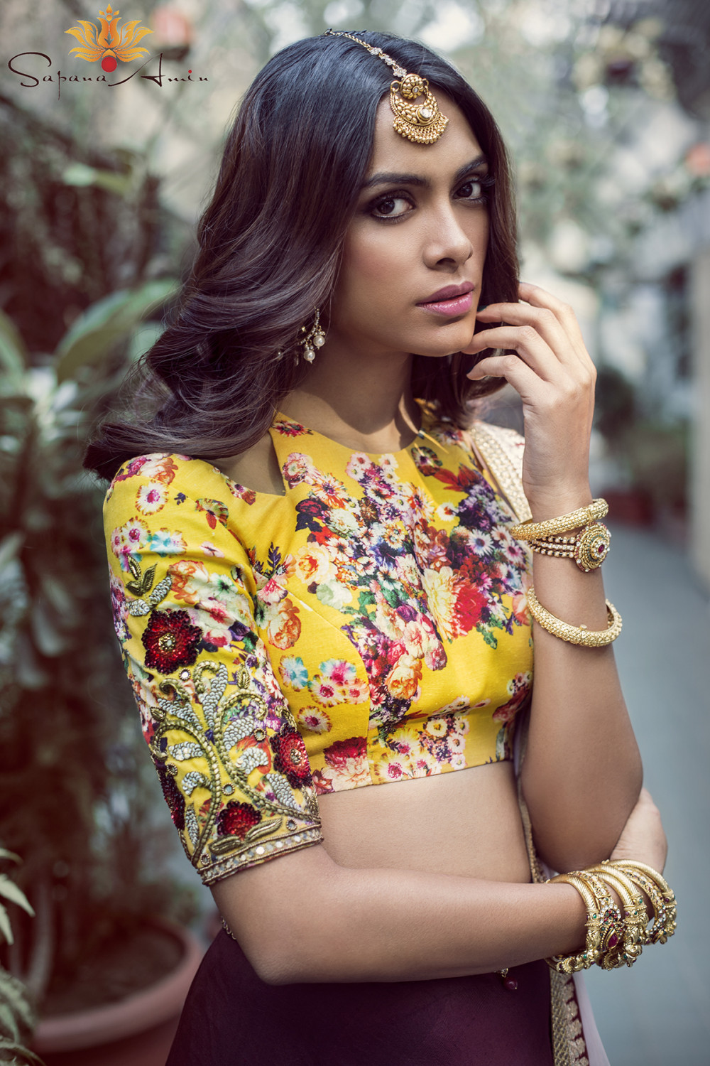 Gold embroidered blouse with a pistachio green floral and gold plaid lehenga wit.....