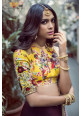 Black georgette top with a choke collar and open back paired with a net lehenga with floral thread e.....
