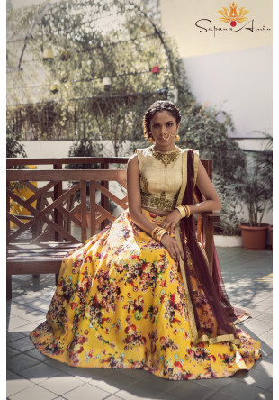 White and Gold Crop Top and Yellow Floral Lehenga
