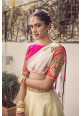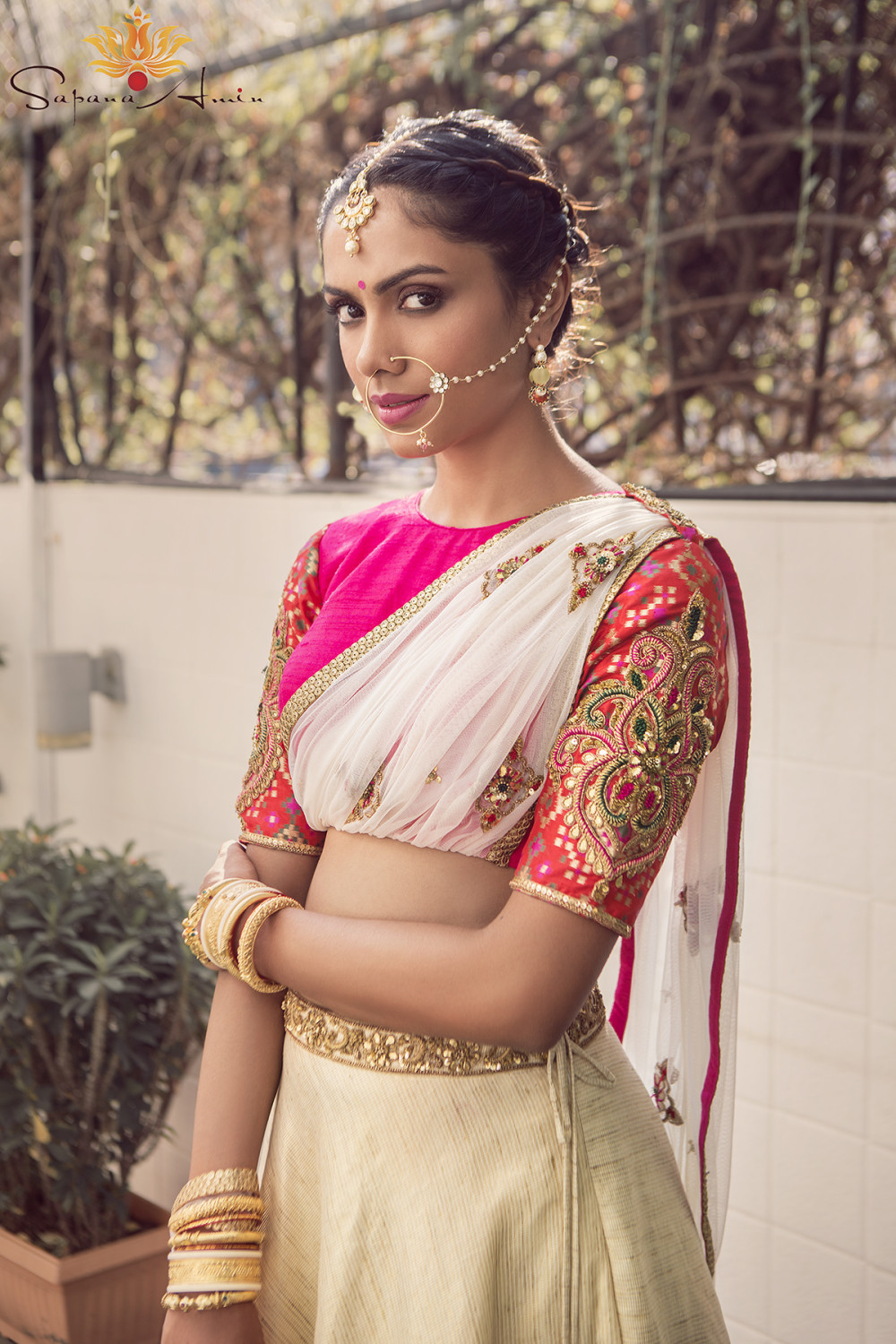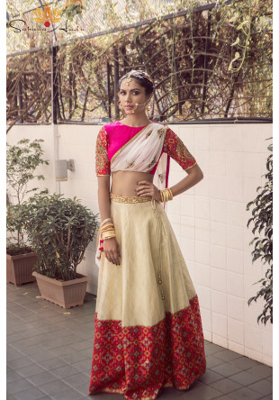 Fuschia pink crop top in raw silk, silk brocade sleeves with embroidery, an attached ivory dupatta in soft net, and a white/gold small-chex skirt with a brocade border