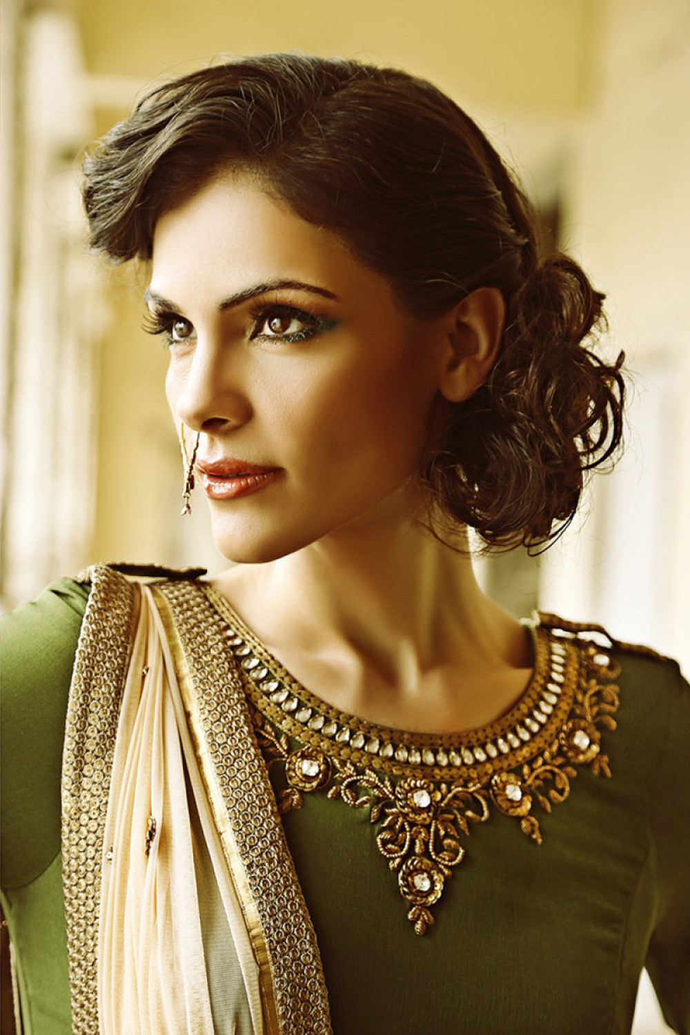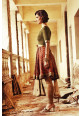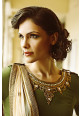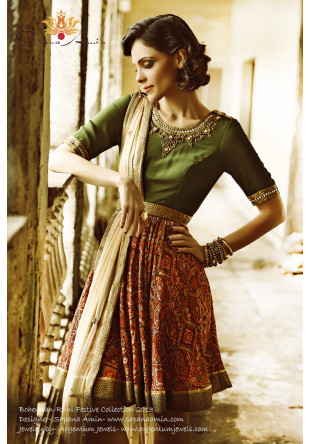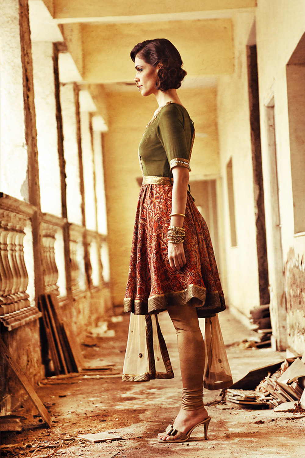 Short olive green anarkali with a silk crepe bodice and tribal print, gold chudidhar pants in lycra, and nude dupatta in soft net