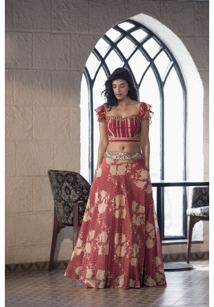 Red lehenga with a striped blouse with ruffled sleeves and a side cut-out, with a polka dot and floral skirt with an embroidered waist band, and a beige net dupatta