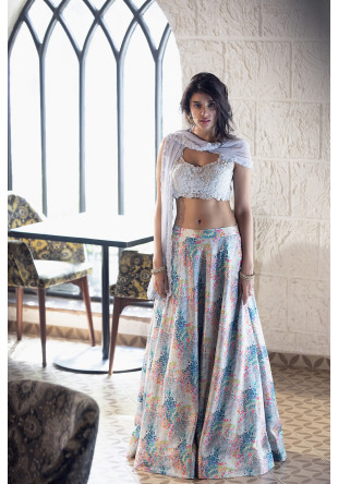 Ice blue lace lehenga with a net embroidered blouse with a multi-color dotted skirt and polka dot net dupatta,