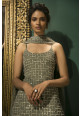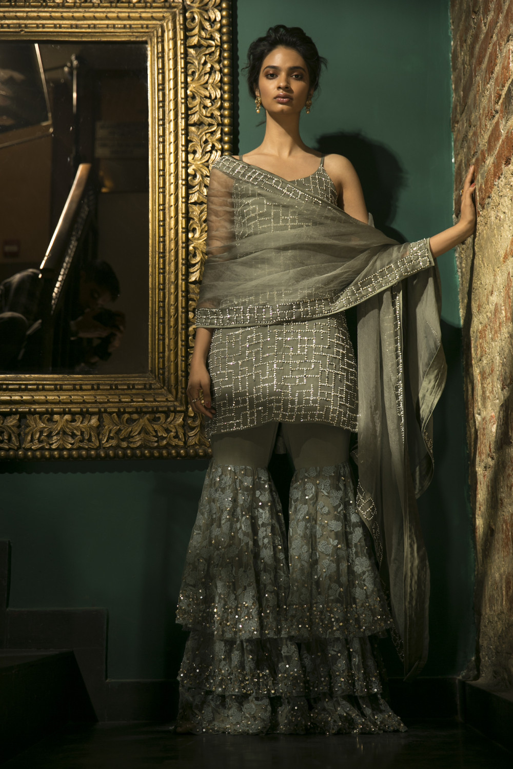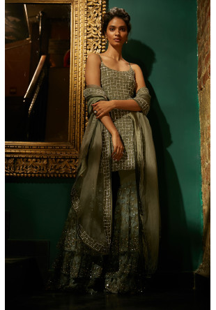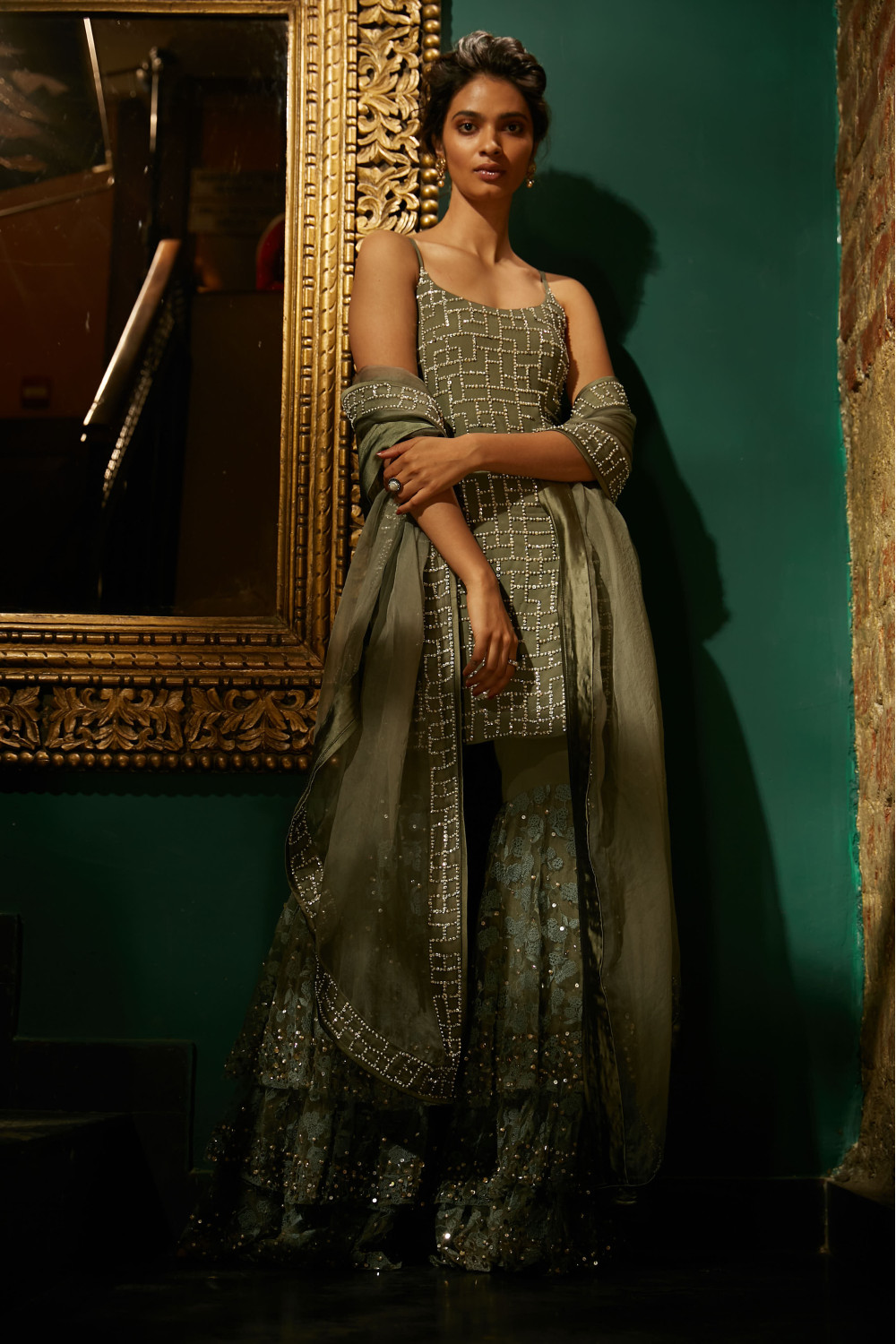 Thread embroidered olive green net layered sharara, paired with a georgette noodle strap shirt in signature checks embroidery with an organza dupatta