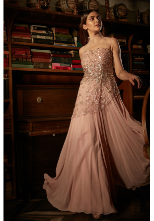 Blush pink gown in georgette with a faux high neckline in net, paired with an embroidered net peplum bustier