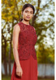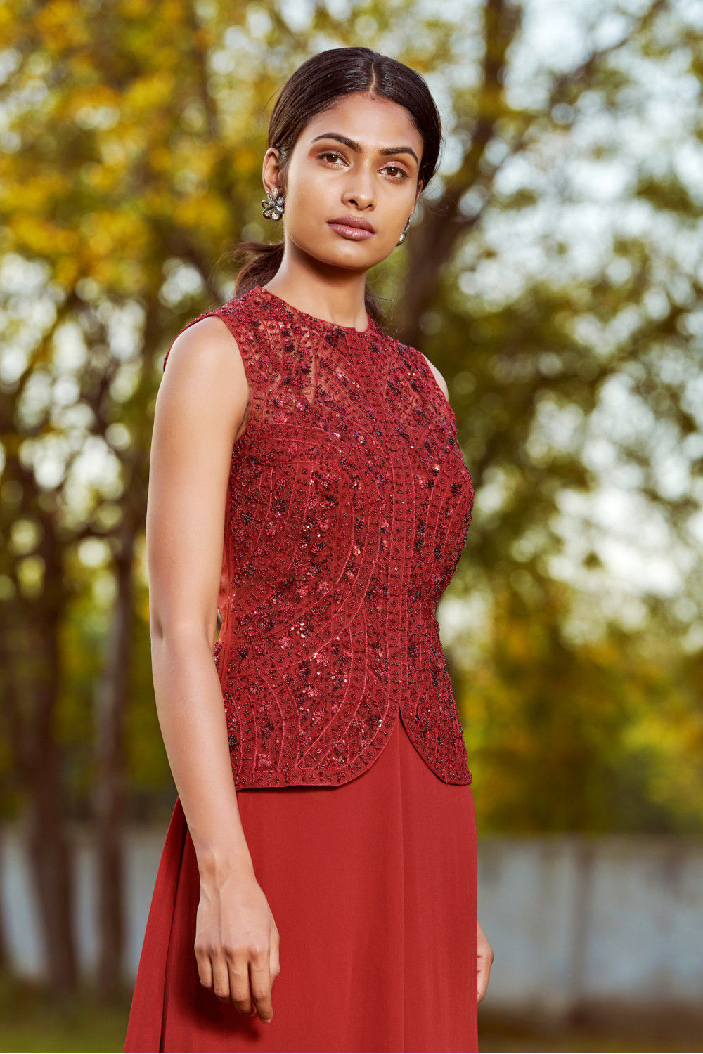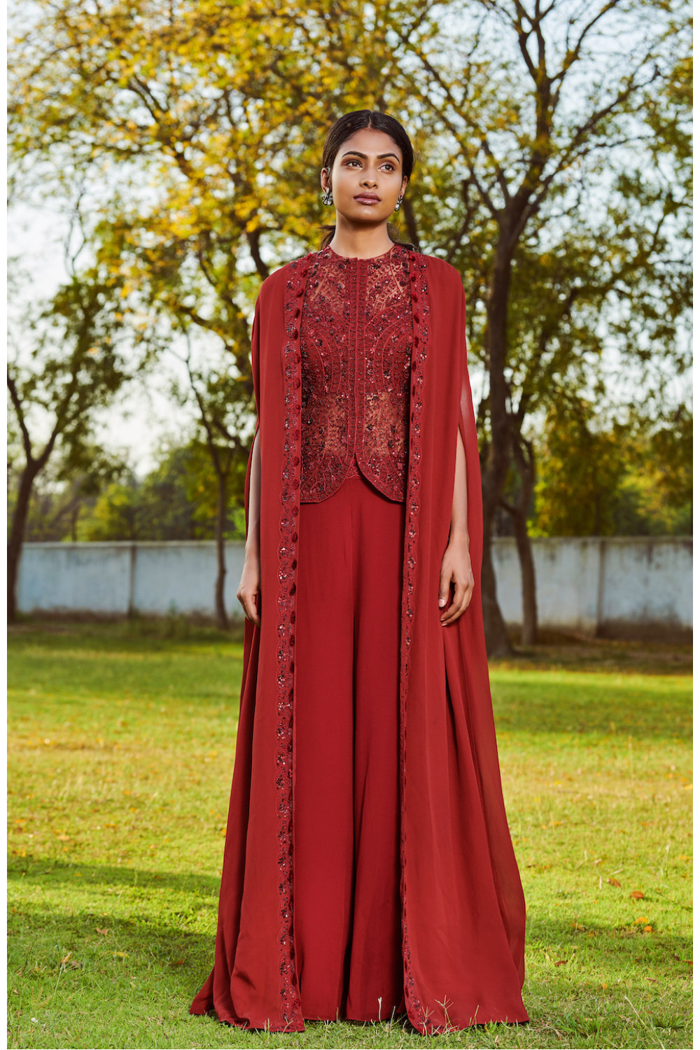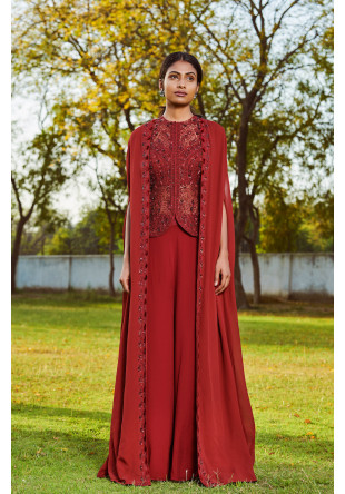 Maroon hand embroidered jacket paired with an embroidered cape jacket and sharara pants