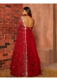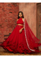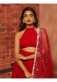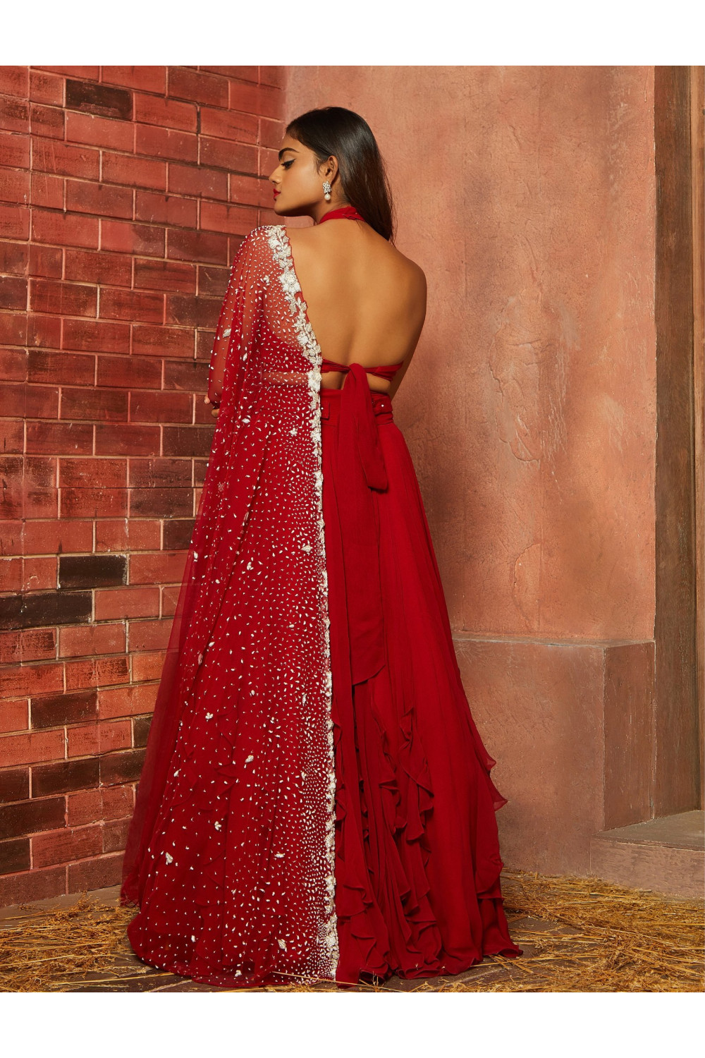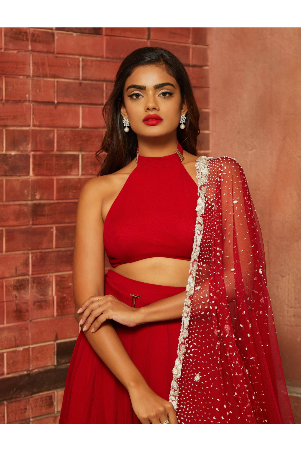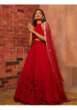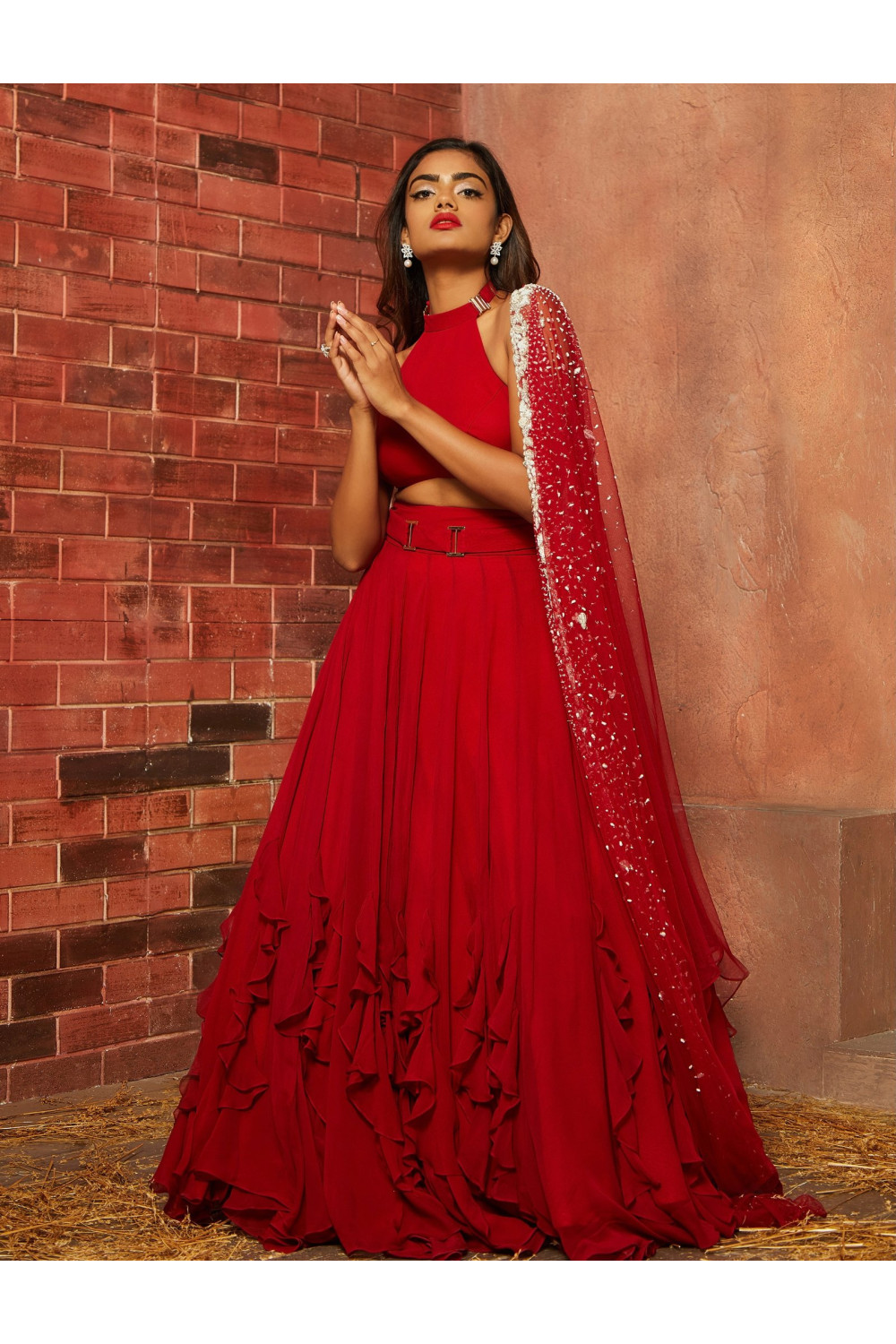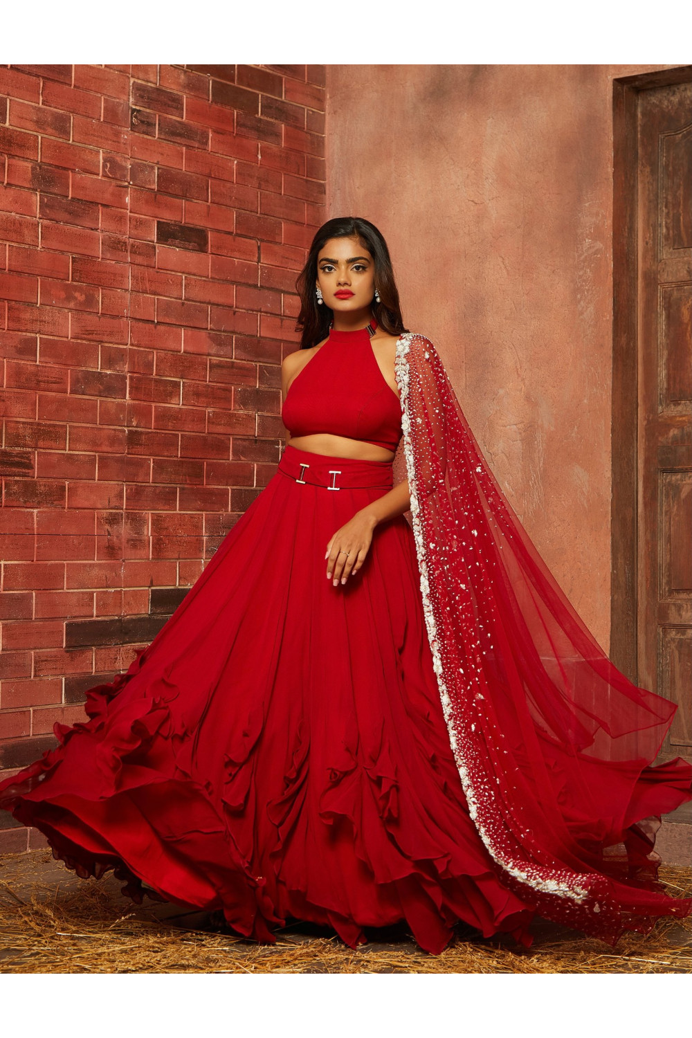 Red georgette ruffle detailed lehenga with a belt and a buckle detailed high neck crop featuring a tie back, paired with a net dupatta with pearl bead hand embellishment