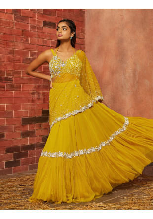 Yellow pearl embellished blouse paired with a net and georgette, tiered lehenga featuring an attached net drape with matching embellishment