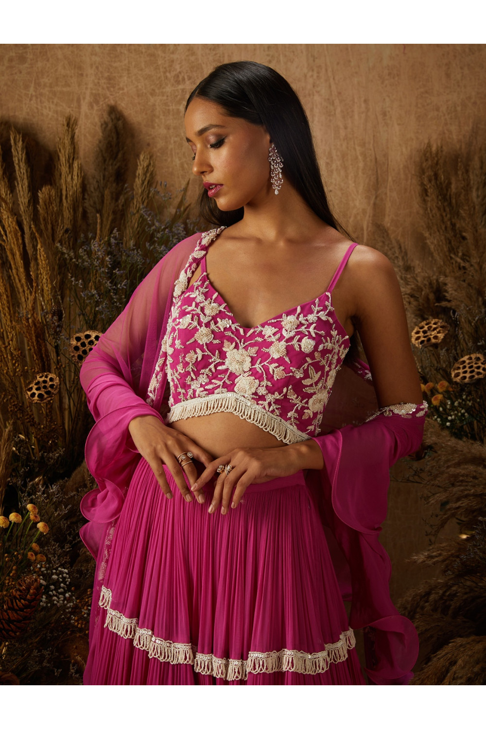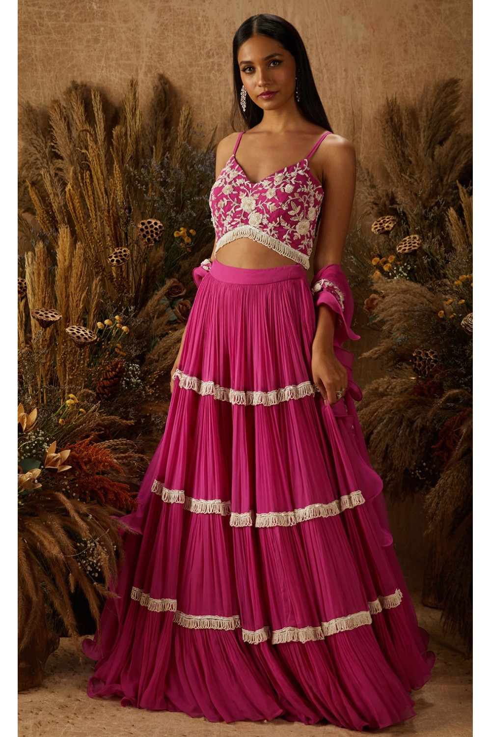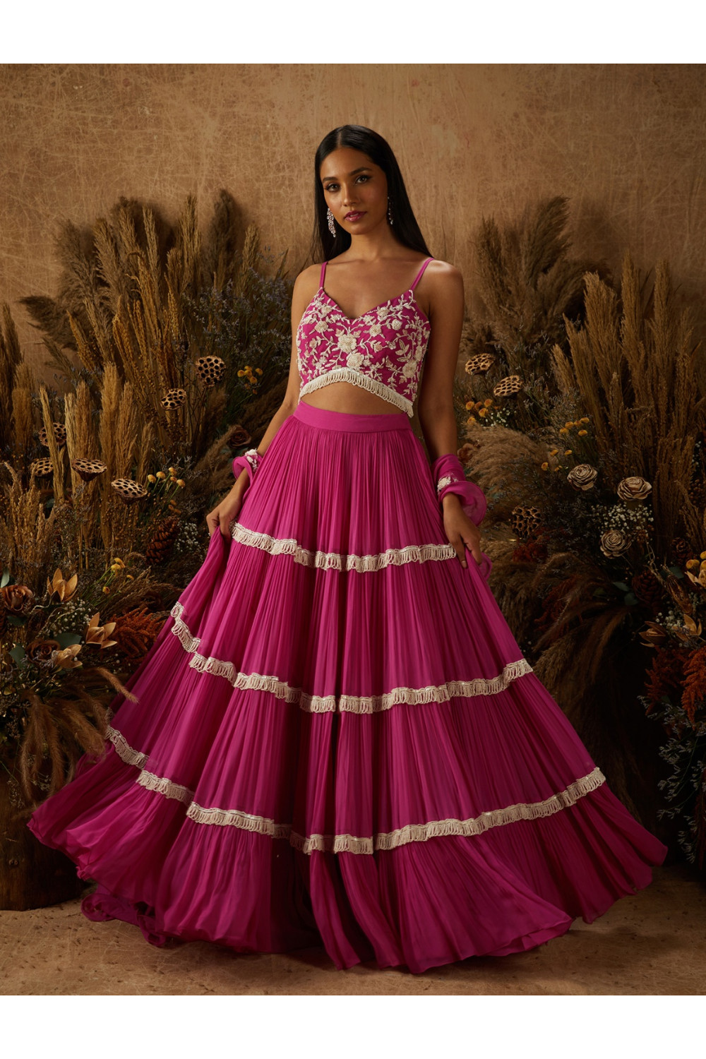 Hot pink tiered georgette lehenga with white beaded loops at intersections paired with a matching blouse hand embellished with white rafia floral embroidery, and a matching embellished net and georgette wire beaded dupatta.