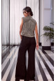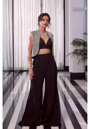 Black overlap half circle embroidered gilet in tussar and bralette with fit and flair pants in organza