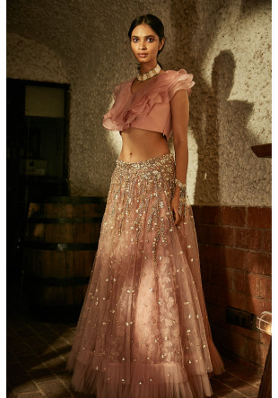 Pink embroidered lehenga in net with embroidered threadwork underlay and frill detailing paired with an organza ruffle top