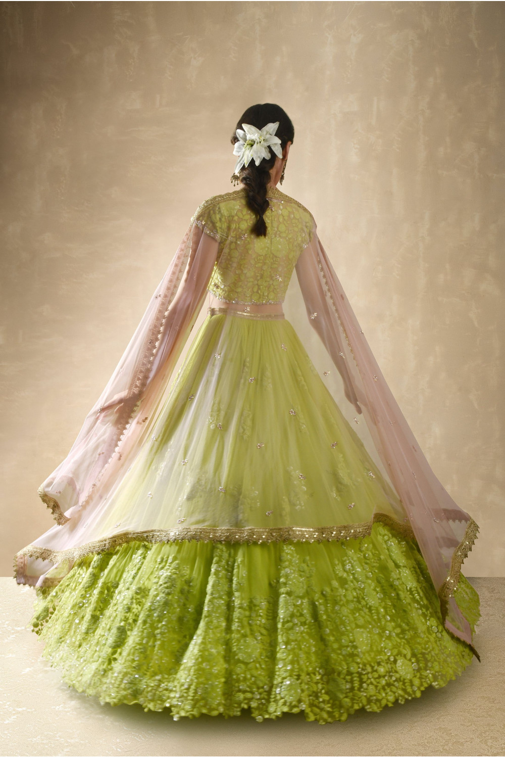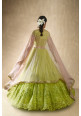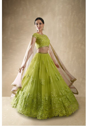 This set features a lime green lehenga set. The skirt has flowy gathers at waist and scattered floral embroidery of sequins and threadwork. It is teamed with a cap sleeved blouse of matching embroidery with sheer back & sweetheart neckline. A rose pink net dupatta with embroidered buttis & cutwork lace completes the look. Cancan & pockets are included.