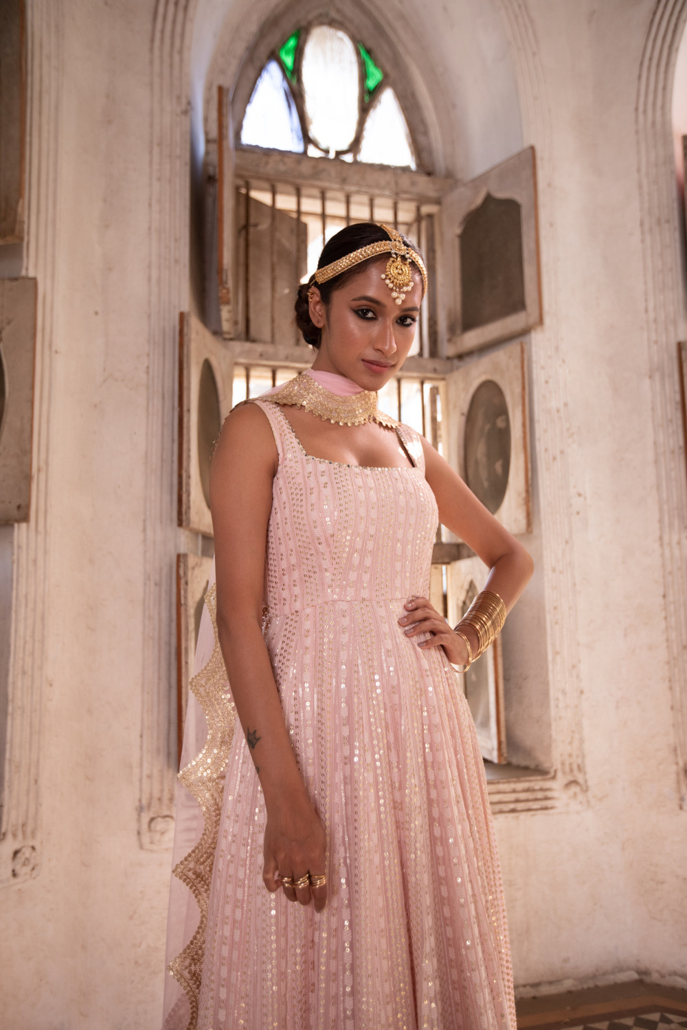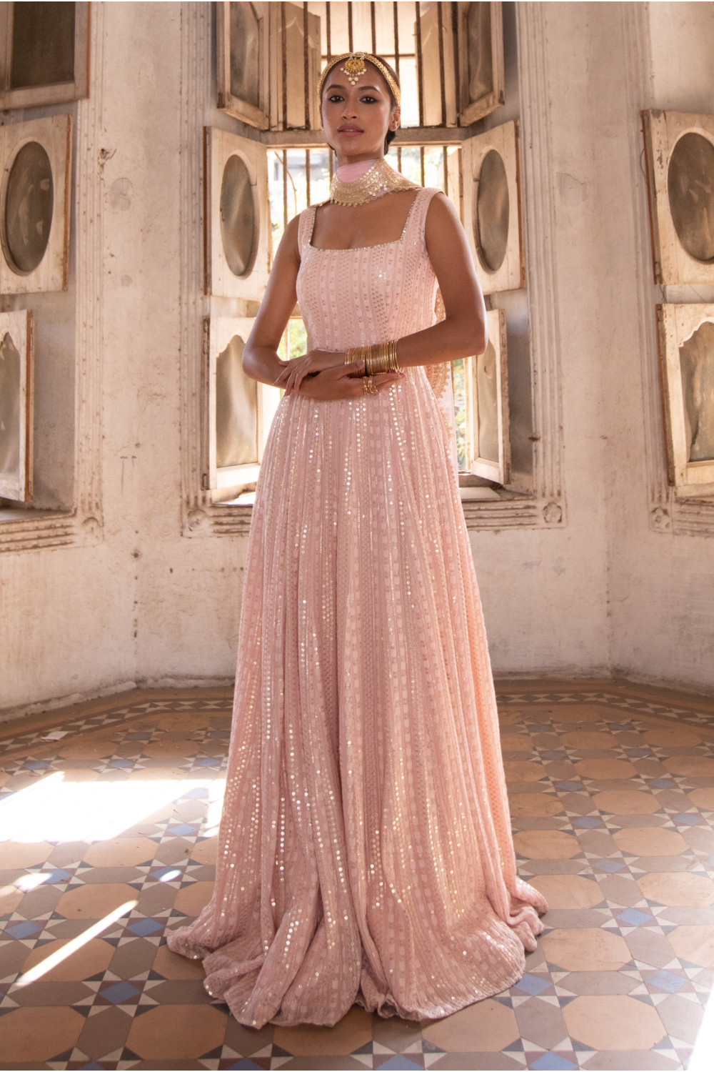 This look features a champagne blush anarkali gown set. The sleeveless ensemble .....